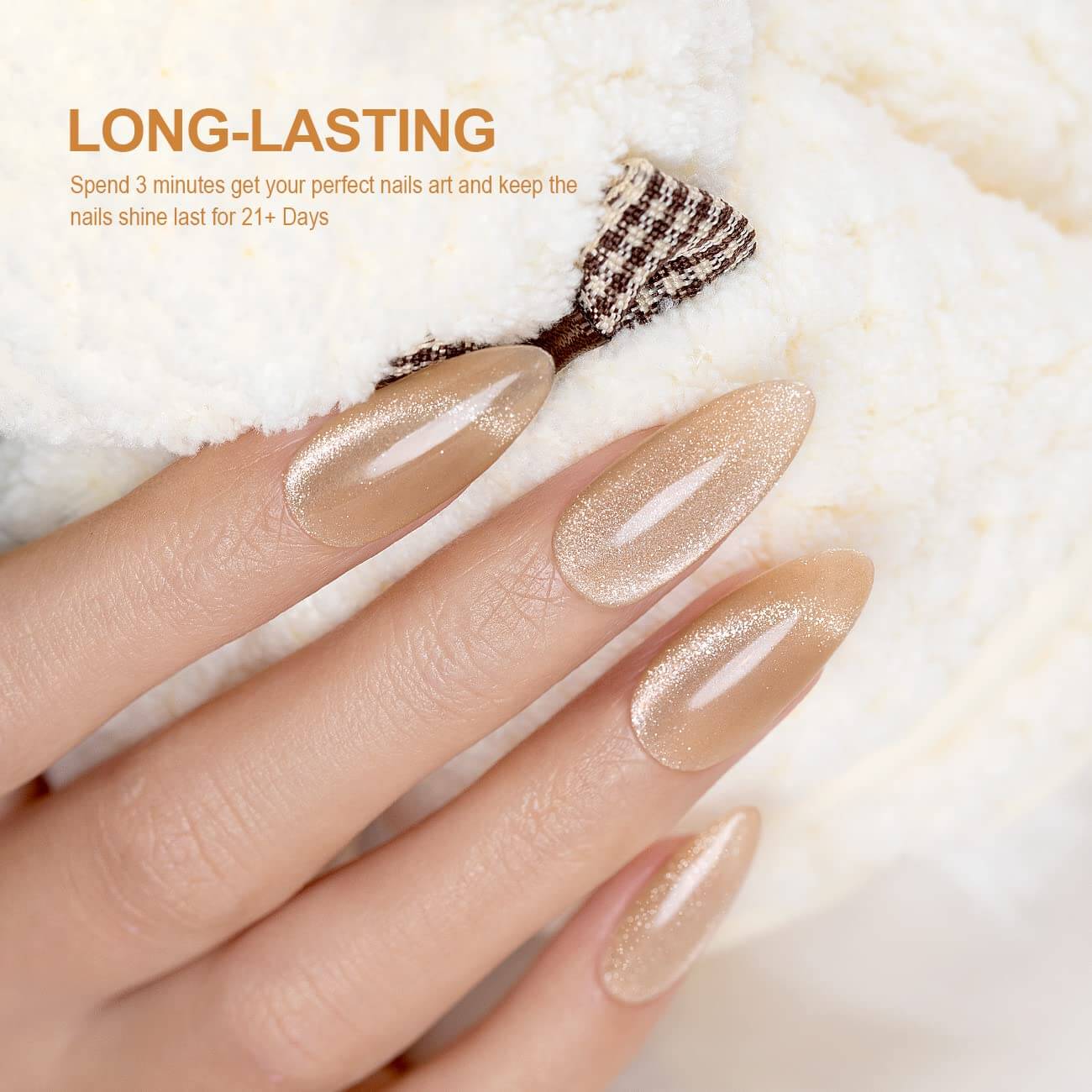 Ice Cat-Eye-Gel-Nagellack hat einen wirklich verträumten Effekt, der das Licht auf die gleiche Weise reflektiert, wie es eine Textur aus zerknittertem Samt tun könnte. Unsere sechs neuen Farbtöne bestehen aus feinen magnetischen Schimmern und durchscheinenden Pigmenten und erzeugen optische Nagellusionen, die sich mit jedem Blickwinkel bewegen. Samtige Katzenaugennägel liegen an den kommenden Thanksgiving-Tagen, Weihnachten und Neujahr im Trend.