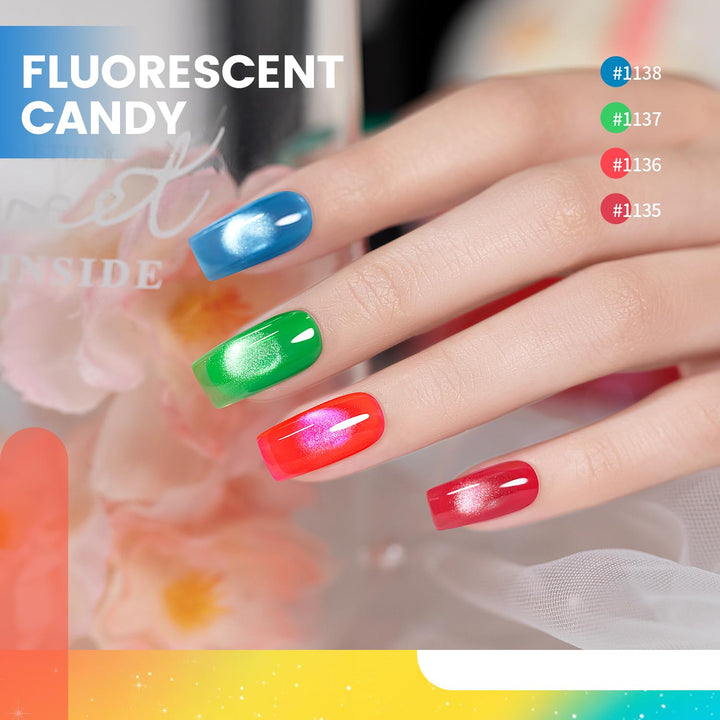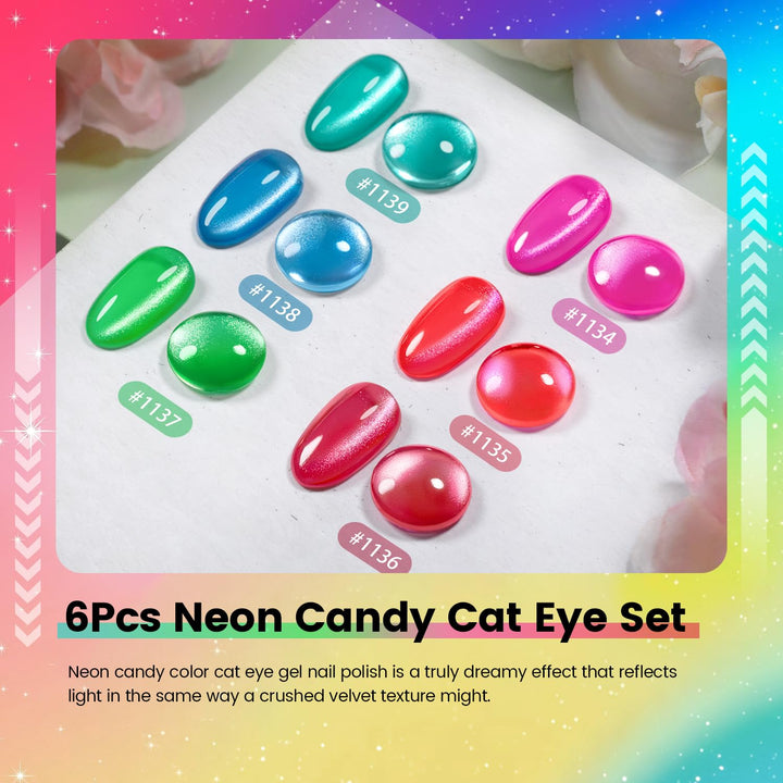 - 6 x 7,5 ml Neon Candy Cat Eye Gel Nagellack (#1135-#1140)