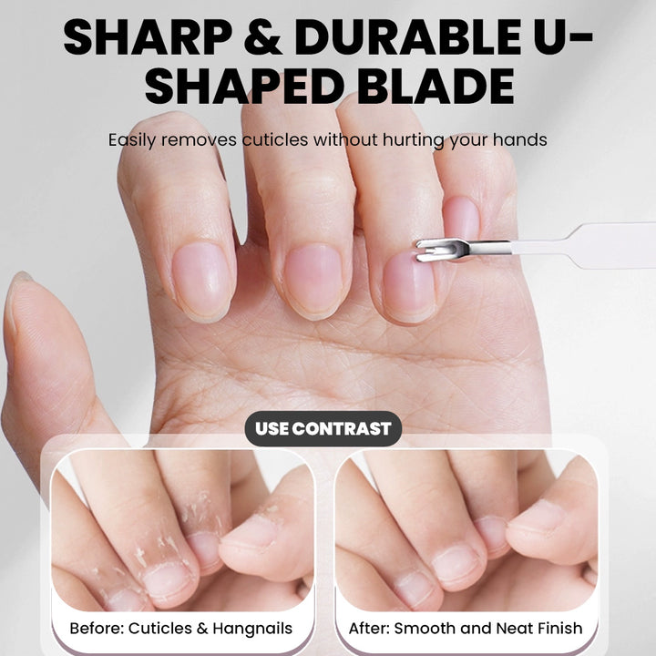 🔺 Removedor de cutículas en forma de U – Diseño afilado pero seguro para la piel para una limpieza rápida de cutículas.