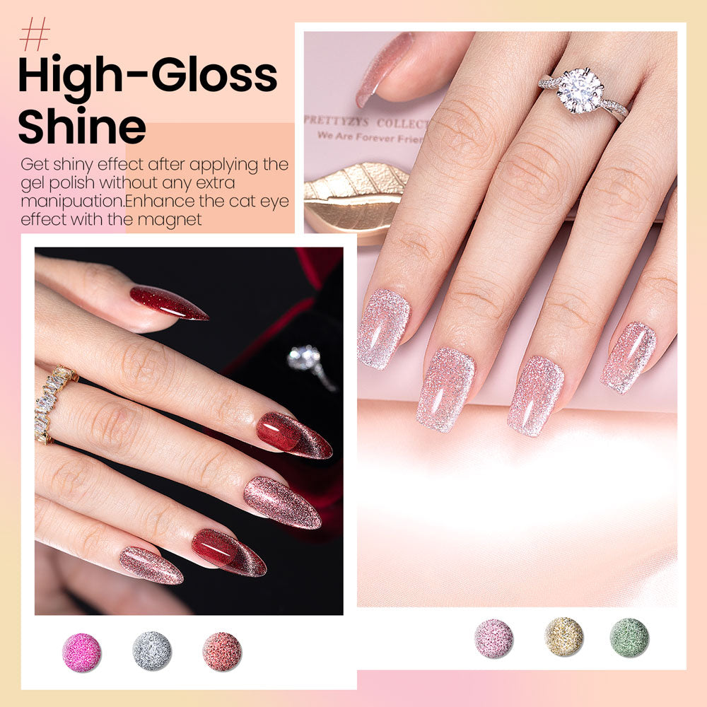 ¡Lleva tu manicura al siguiente nivel con nuestro juego de esmaltes de uñas en gel Shiny Platinum Cat Eye de 6 piezas! Haz una declaración en cada fiesta con nuestra serie de geles con purpurina 3 en 1 que combina el brillo del platino, el reflejo y los efectos de ojo de gato. ¡Prepara tus uñas para robar el protagonismo!