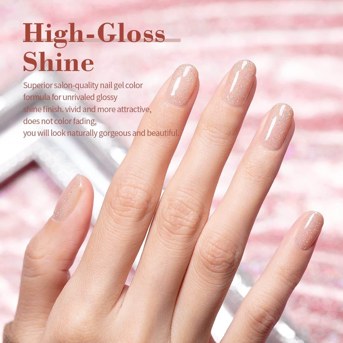 【ESmalte de gel nude con brillo】Las uñas de color rosa nude siempre aportan belleza natural y pura a todas las edades y el esmalte de uñas en gel con brillo es una de las formas más elegantes de usar esta tendencia. El color en tonos nude está plagado con brillo de arcoíris que se refleja y centellea sin importar dónde la luz incida en la uña.