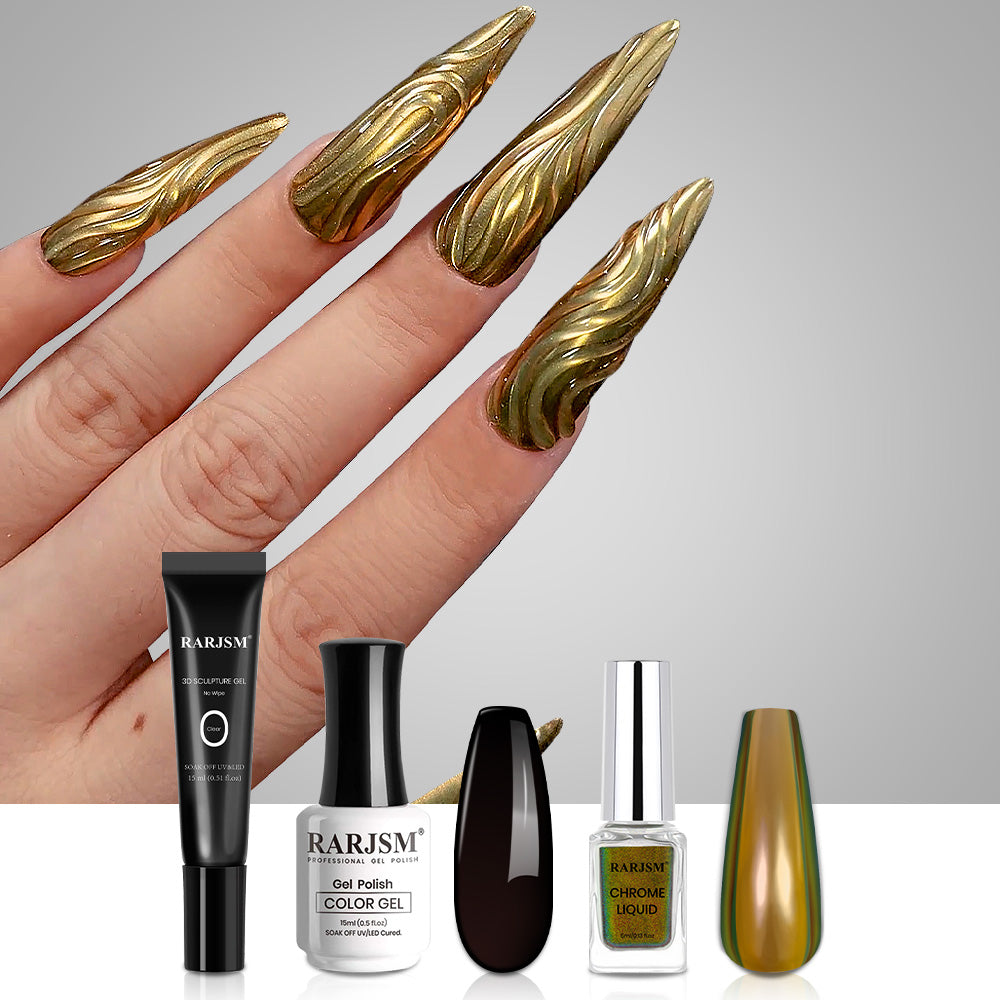 La manucure 3D Golden Mirror offre un effet éblouissant et brillant avec sa finition dorée réfléchissante et ses motifs multidimensionnels. Cette tendance présente des éléments sculpturaux audacieux qui créent une superbe surface semblable à un miroir, parfaite pour celles qui recherchent un look d'ongles luxueux et accrocheur.