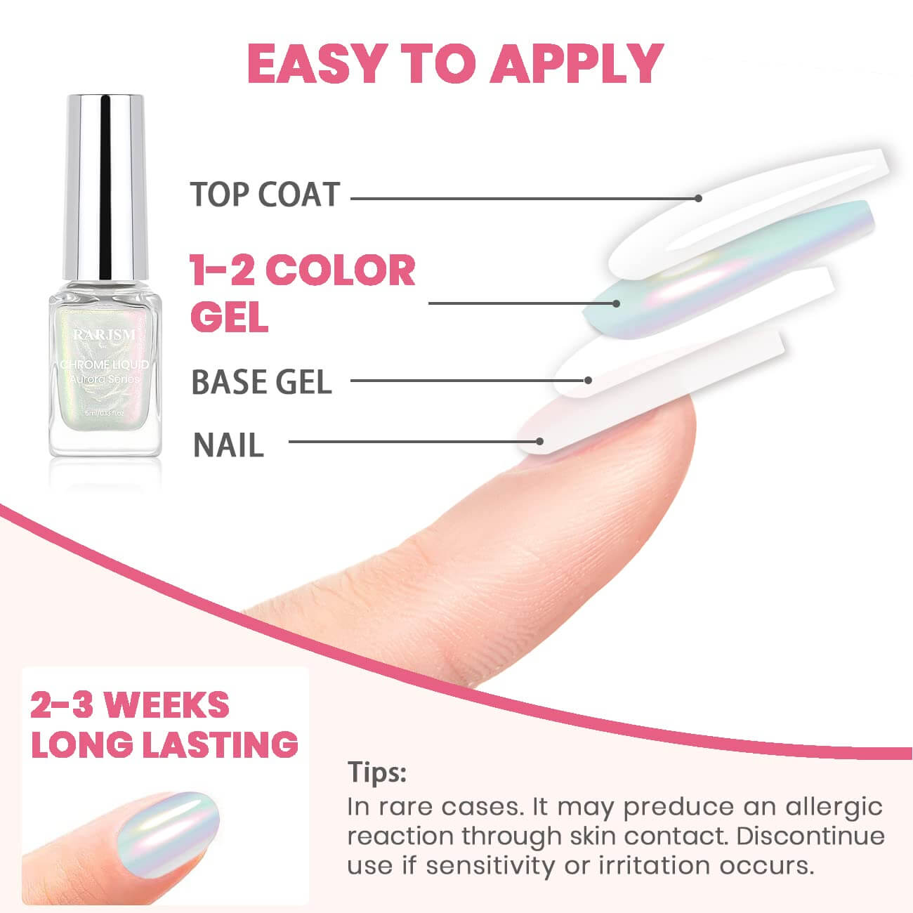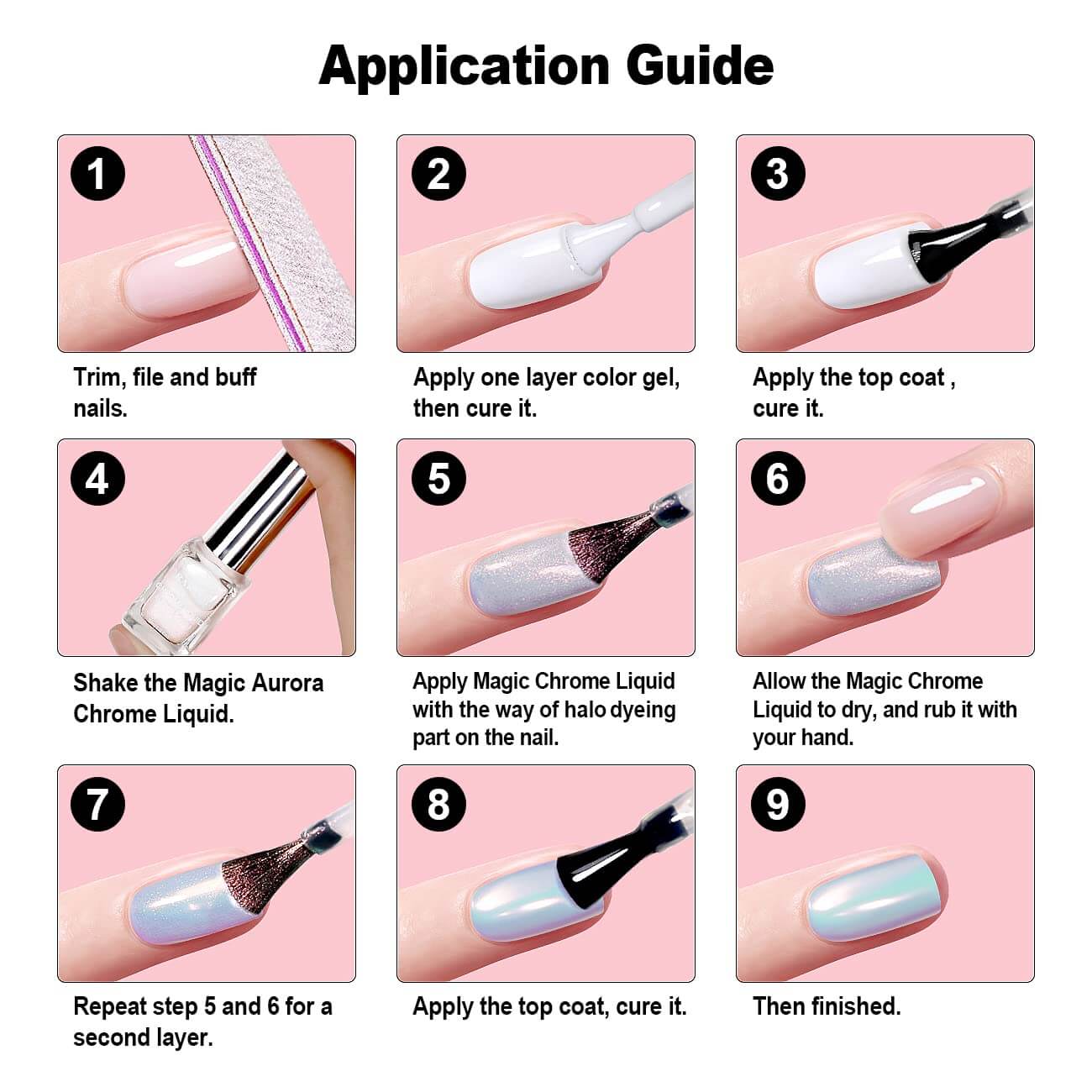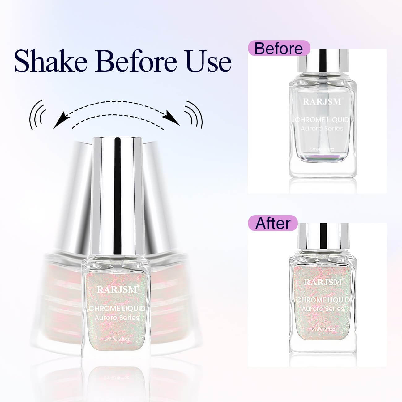 Ti presentiamo le polveri cromate di nuova generazione, RARJSM Magic Liquid Powder! Niente più pigmenti che si sollevano, si staccano, disordinano o volano via! Questa rivoluzionaria formula con pennello è facilissima da applicare e ti regala un look colorato e brillante sulle unghie! Inoltre hanno effetti diversi su diversi colori di base! Prendili per scoprire look per unghie più sorprendenti!Si combina perfettamente con qualsiasi smalto per unghie di colore base. Applicandolo su gel di colore diverso si otterranno effetti diversi, applicandolo su un'unghia in gel nero si otterrà un effetto metallico;Applicando su trasparente unghie nude puoi ottenere l'effetto aurora perlata.