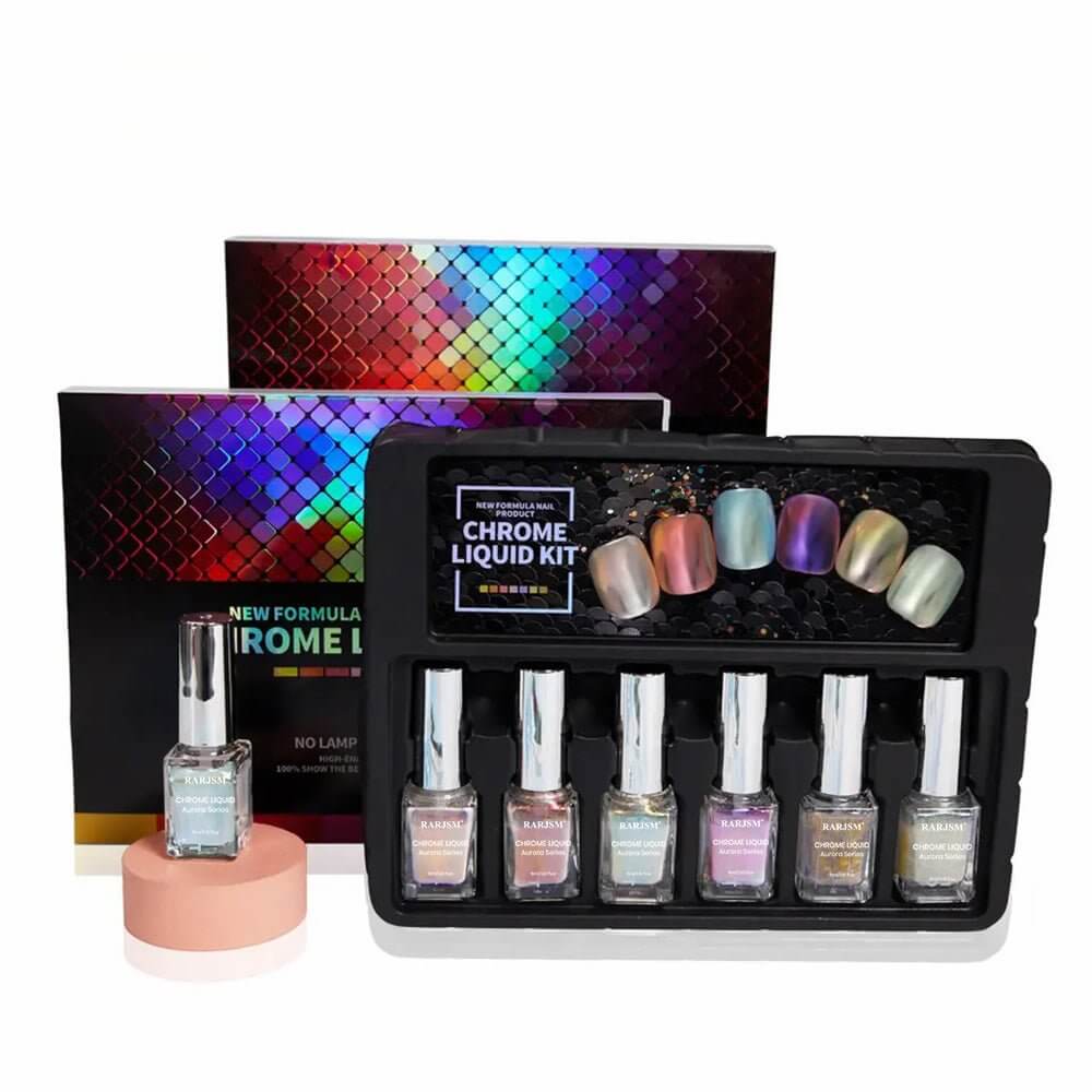 Kit Polvere Liquida per Unghie Effetto Specchio Cromato Perla - 6 Colori Effetto Aurora 5ml