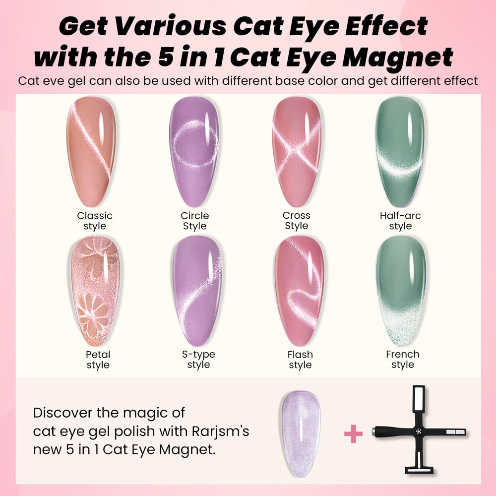 Discover the magic of cat eye gel polish with Rarjsm's new 5 in 1 Cat Eye Magnet. This multifunctional cat eye magnet comes with five different magnets that allow you to easily create various cat eye effects, such as flower, French, side light, oblique, cross, and wide light cat eyes. The soft silicone cover ensures a comfortable grip while also protecting the magnet from breakage. Portable and lightweight, this magnet is perfect for on-the-go nail art. Its unique cross shape makes it easy to locate among your other nail art tools. Shop now to elevate your cat eye nail art game!