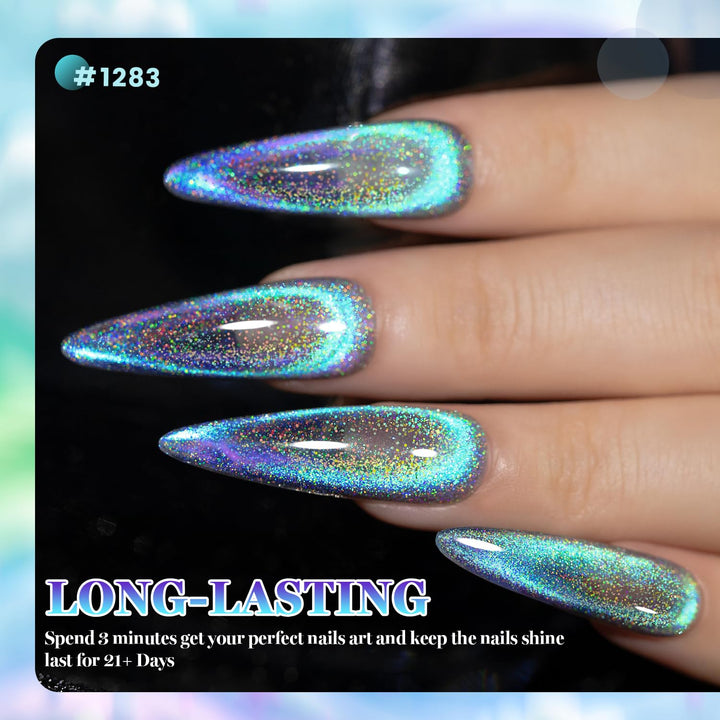 Step into a galaxy of color with Blue Purple Holographic Cat Eye #1283. This mesmerizing gel blends blue–purple color-shift shimmer, holographic micro-sparkles, and a magnetic cat-eye beam to create a multidimensional, cosmic glow on your nails.