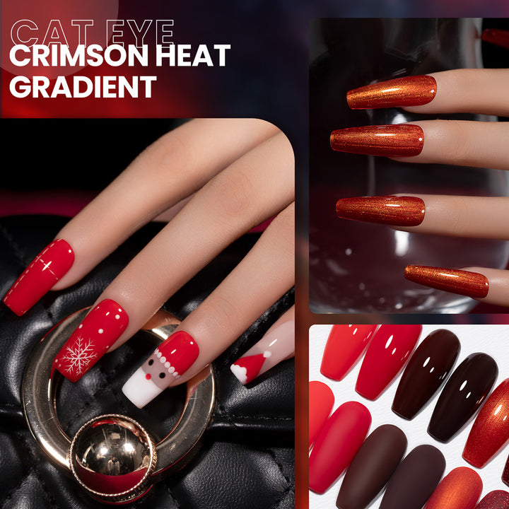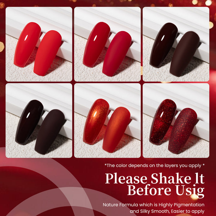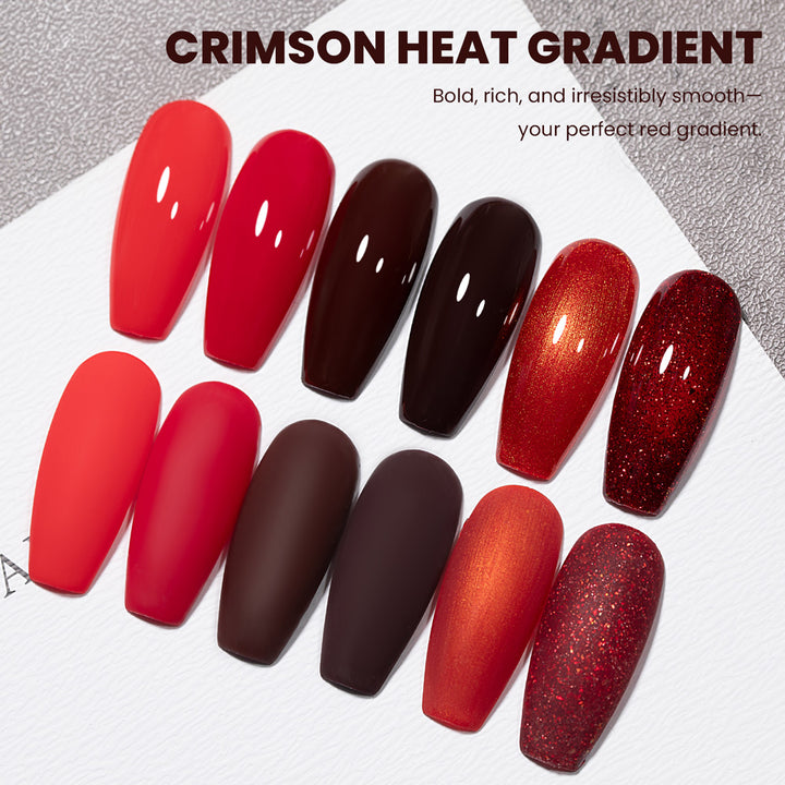 Elevate your autumn and winter manicures with the Crimson Heat Gradient Collection, a curated set of 6 essential red gel polishes designed for the colder seasons.