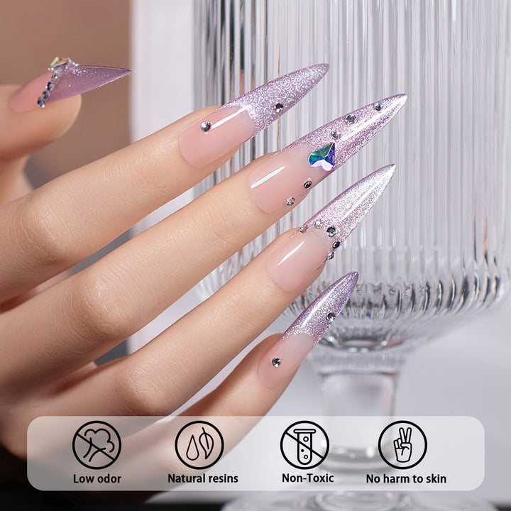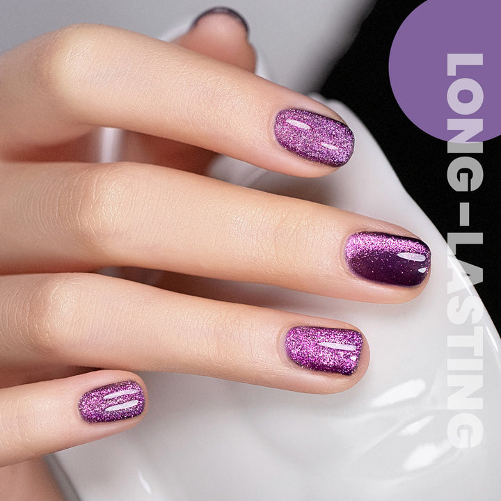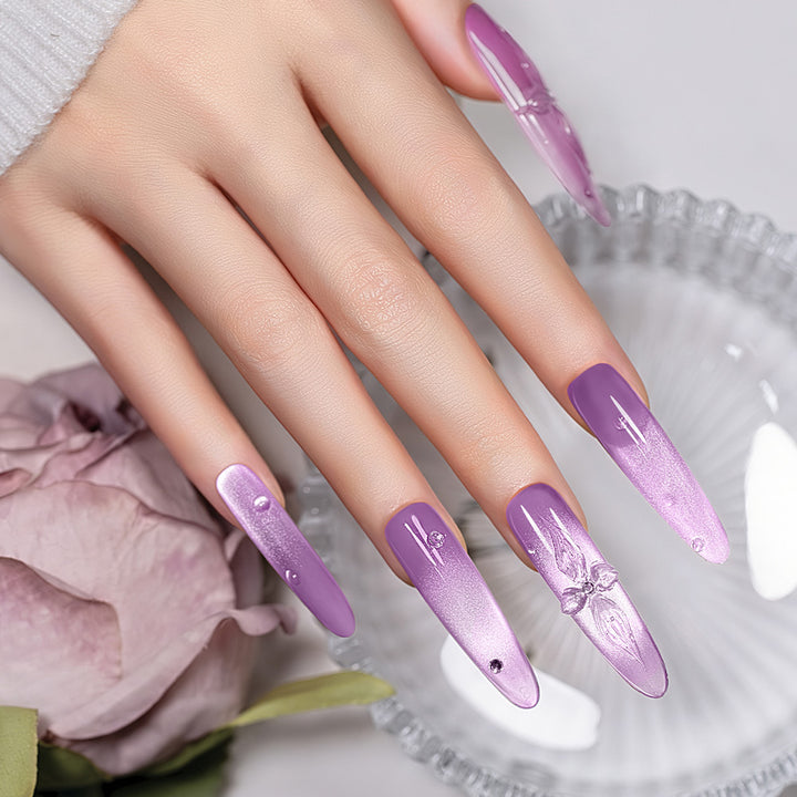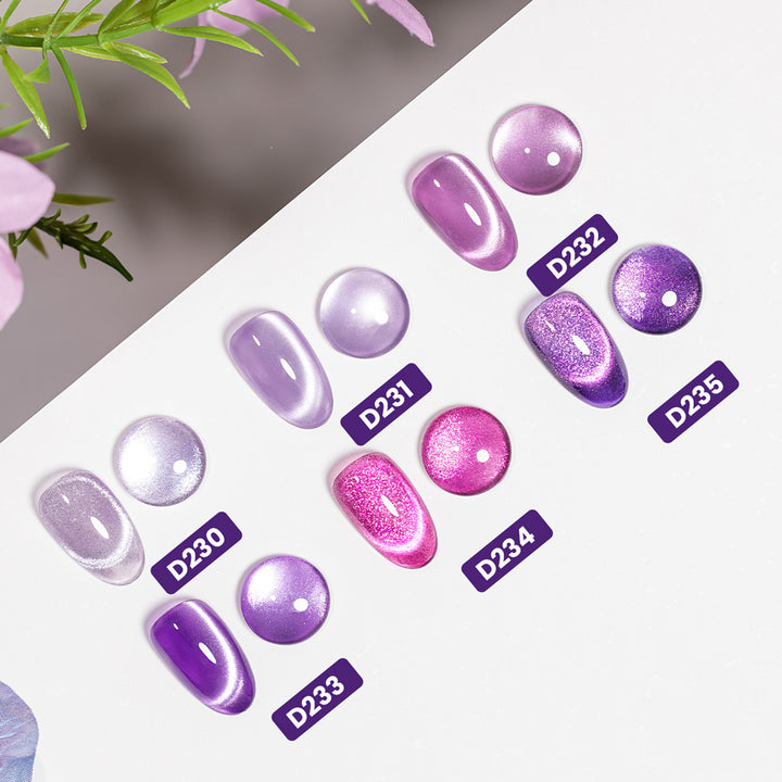 A magical journey through shades of purple — from soft lavender haze to dazzling cosmic violets. This 6-color cat eye gel polish set is made for those who dream in purple.
