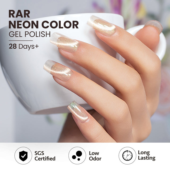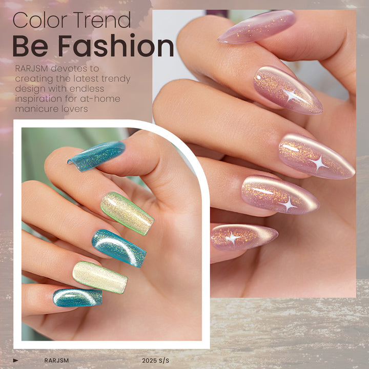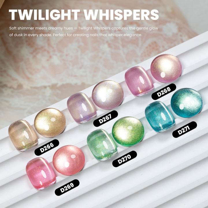 Discover the Twilight Whispers Collection — a 6-color set of semi-sheer, soft-hued cat eye gel polishes infused with fine golden shimmer. When paired with a magnet, each shade reveals a flowing line of luminous gold, like golden light dancing in a gentle evening mist.